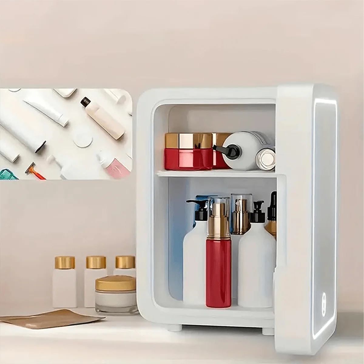 Mini frigiderul pentru cosmetice de 8 litri este soluția practică pentru păstrarea produselor de îngrijire la temperatura optimă. Conceput special pentru beauty și uz personal, combină funcția de răcire și încălzire cu o oglindă iluminată LED, fiind ideal pentru acasă, birou sau călătorii.